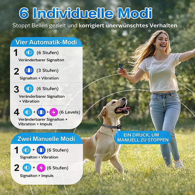 Individuell anpassbares Training: Mit mehreren Trainingsmodi – Signalton, Vibration und Impuls – lässt sich das Verhalten Ihres Hundes präzise steuern. Die Intensität kann fein abgestimmt werden, sodass immer die mildeste wirksame Stufe gewählt werden kann.